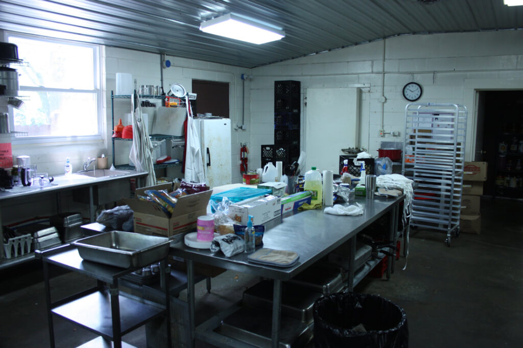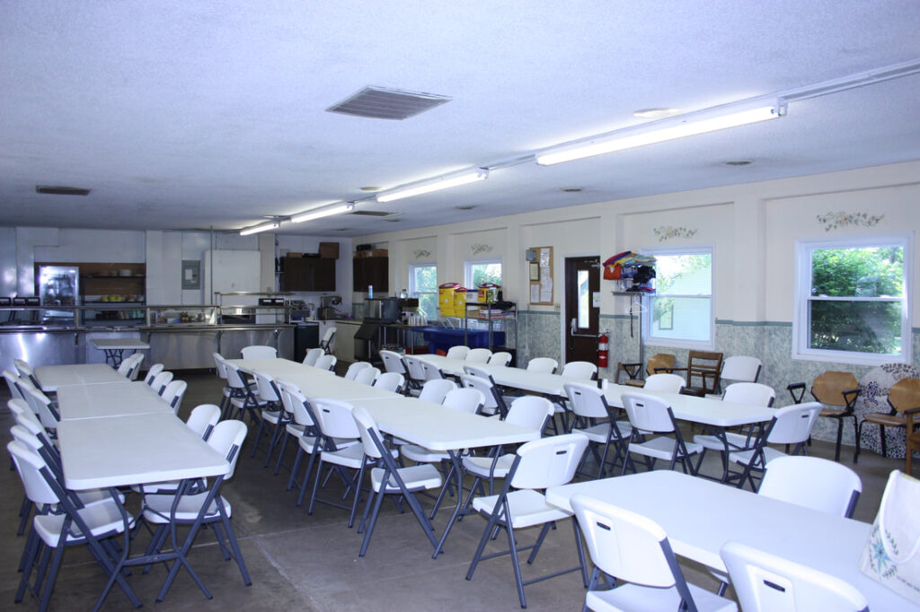 The dining hall and kitchen can easily accommodate up to 100 guests. There are 14 long tables and 100 chairs available in the building. The dining hall also has Wi-Fi and a mounted projector screen. The kitchen is equipped with a 5 pot bun coffee maker, ice machine, hot bar, 6 burner gas range with griddle, convection oven, commercial dishwasher, meat slicer, walk in cooler, upright cooler, and 1 chest freezer.